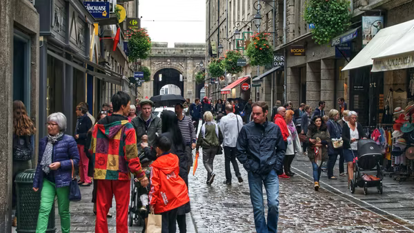 A man carried a newspaper folded under one arm and another man a tennis racquet, while a woman, on her way to the sports centre, had a rolled yoga mat.